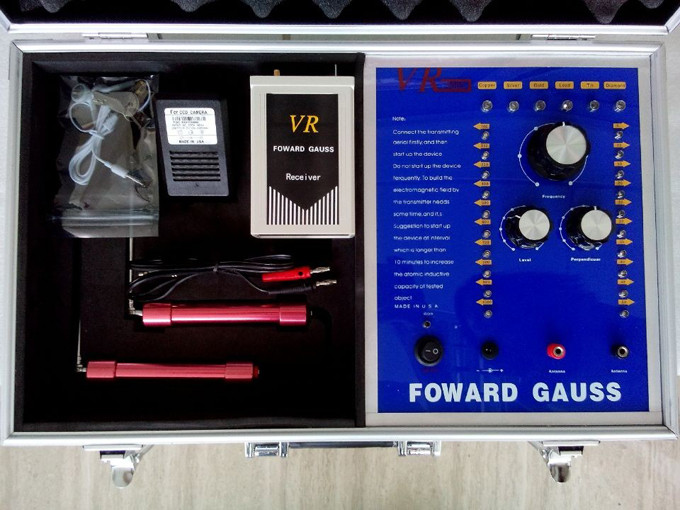 一個鑲有鋁邊并帶有把手和兩把鎖的白色箱子,該箱子里裝有發(fā)射器和其它 附件。該發(fā)射器是安裝在盒子里,發(fā)射器的面板上有六個LED頻率指示燈,且每個指示燈都代表某項功能,字母C開頭的表示銅,字母S開頭的表示銀,字母G開 頭的表示金,字母L開頭的表示鉛,字母T開頭的表示錫,字母D開頭的表示瓷器玉石。在指示燈的下面有個頻率選擇開關(guān),可以自由調(diào)節(jié)您所需要探測的金屬種類。頻 率選擇開關(guān)的下面,有兩個旋鈕,分別標(biāo)有"水平"、"垂直"字樣,分別代表探測深度與范圍。左右各有一豎排十個指示燈,可以用水平或者垂直鈕來調(diào)節(jié)您所要 選擇的探測深度和探測范圍(探測深度為10-100M,每10M一個指示燈共計十個,探測范圍為200-2000M,每200M一個指示燈共計十個)。主 機面板下方一排從左起為電源總開關(guān),電源充電孔,以及一紅一黑的兩個發(fā)射天線插孔。充電電路已經(jīng)被設(shè)計在儀器內(nèi)部,電池安裝在儀器中部的面板下面。(切 記:充電時請先用大陸公司贈送的220V轉(zhuǎn)110V的轉(zhuǎn)換器插入家用電插座然后將充電器接插在轉(zhuǎn)換器上)