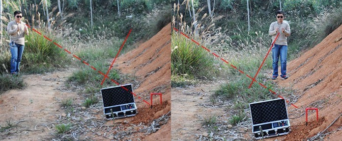 8. 重復(fù)第六步。當(dāng)你接近發(fā)射天線和測試物這條線的時候,接收天線應(yīng)該是交叉的。(記住:測試物和發(fā)射天線之間的信號線將會形成,而不是測試物和 發(fā)射器之間 的信號線)。當(dāng)你走過這條線的時候,接收天線將不會交叉。在天線交叉處做下標(biāo)記。現(xiàn)在,再遠(yuǎn)離發(fā)射器一些距離(如果一。開始距離發(fā)射器5到6米,則應(yīng)到8 米處)。重復(fù)上述過程:在接收天線交叉處做下標(biāo)記。然后通過發(fā)射器和做標(biāo)記的兩個地方畫一條線,這就是你確定的X軸。關(guān)掉發(fā)射器和接受器,然后等15分 鐘,把發(fā)射天線和發(fā)射器挪到一個新的地方,重復(fù)這一過程。記住要把發(fā)射天線埋進去。這次你確定了Y軸,X軸和Y軸的交叉處即目標(biāo)物所在地。