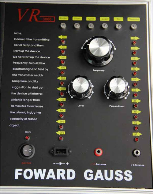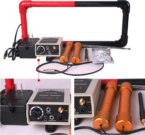 探測時,把發(fā)射器放在地面上,把發(fā)射天線連接到發(fā)射器的對應(yīng)的插孔內(nèi)。在發(fā)射器打開的時候。不要插拔發(fā)射天線,如果那樣做的話,將會對機器造成損壞,對操作人員造成嚴重傷害。在發(fā)射器的前面,挖一個小的壕溝,把發(fā)射天線埋到溝里,埋到黑線處。把頻率選擇設(shè)置到需要的位置。打開發(fā)射器,然后逆時針旋轉(zhuǎn)&ldquo;水平&rdquo;和&ldquo;垂直&rdquo;兩個旋鈕到至大處,然后再順時針旋轉(zhuǎn)著兩個兩個按鈕,直到它們上面對應(yīng)的兩個指示燈變亮(這個用來設(shè)置發(fā)射器適合地面情況)。在3到5分鐘之后,站到離發(fā)射器5到6米遠處,像上面練習使用接收天線的時候一樣,圍繞這個發(fā)射天線做圓周運動,保持距發(fā)射天線的距離5到6米遠,如果這個區(qū)域沒有要找的目標物,接受天線不應(yīng)當交叉。